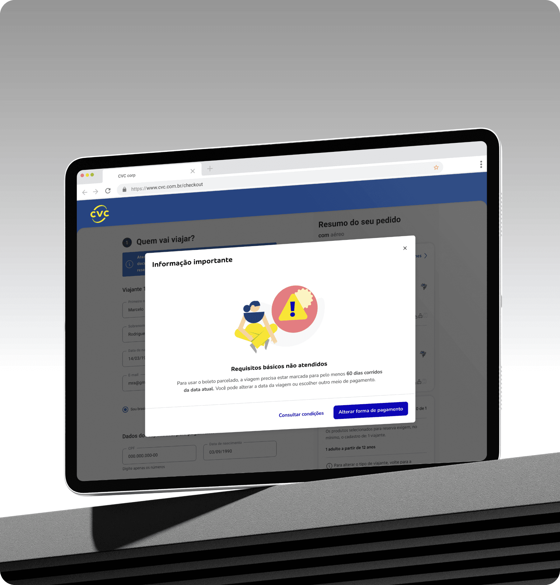 An explanatory modal details conditions and steps before the customer starts the process.