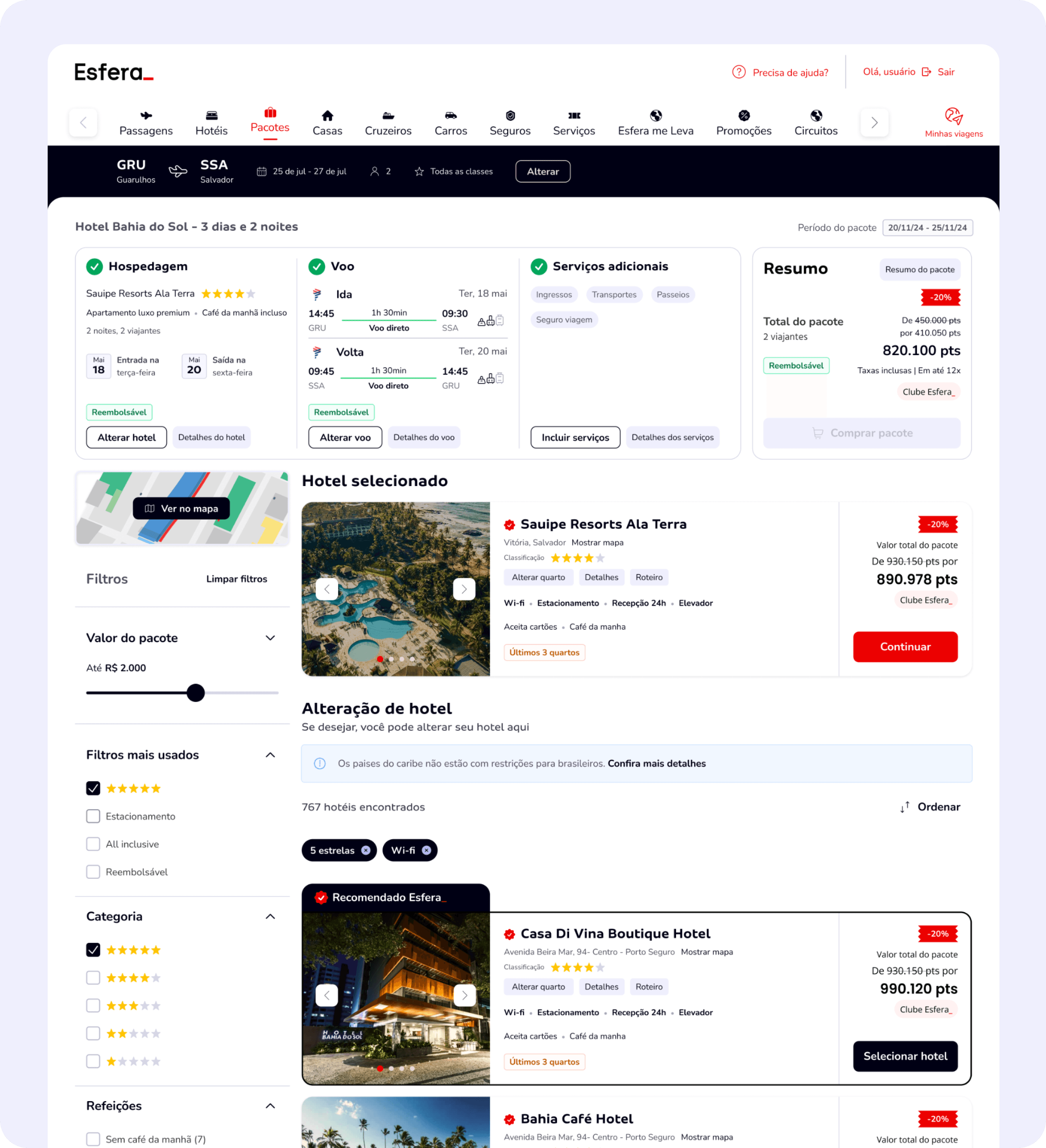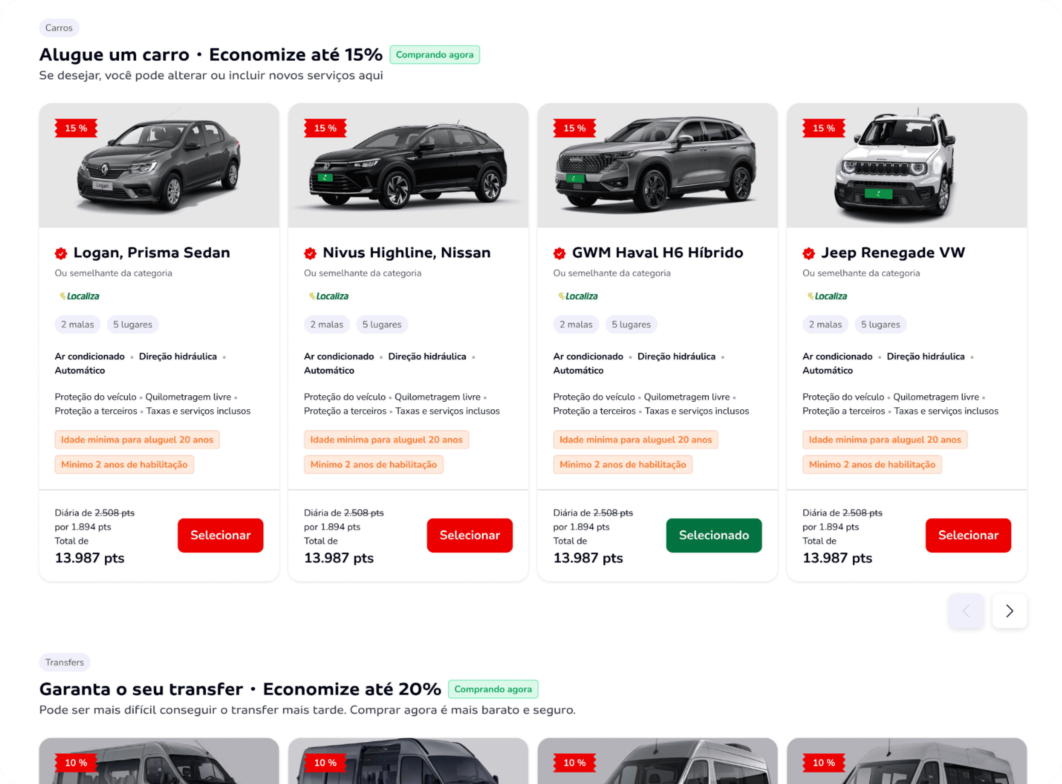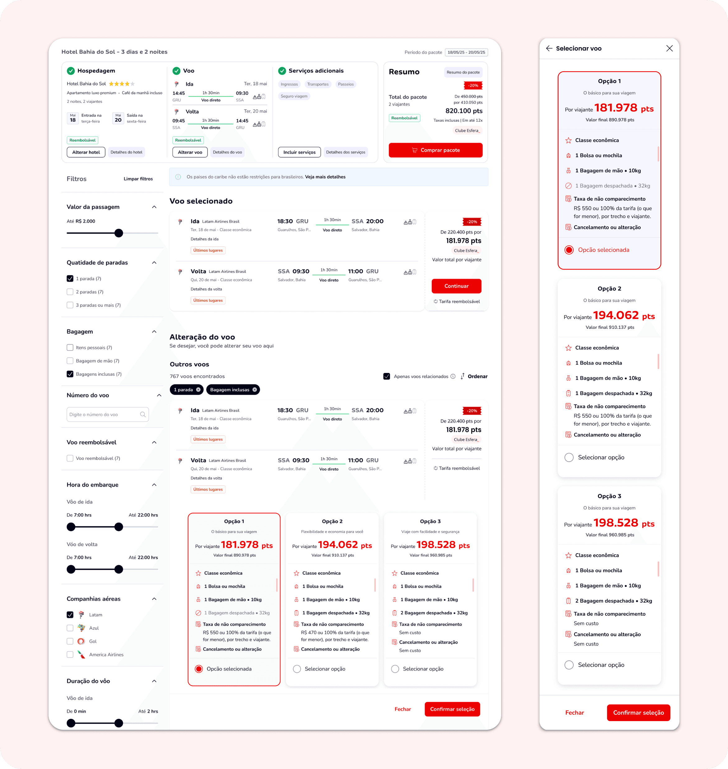 During the flight selection step, we implemented an upsell system that highlights more complete options based on criteria such as flight class, baggage allowance, change and cancellation policies, additional fees, and other benefits. This approach brings more transparency and helps users make informed decisions by clearly presenting the cost-benefit of each alternative.